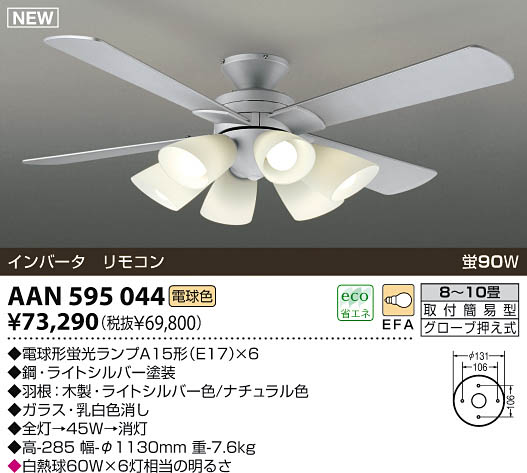 コイズミ照明 AKARI CLUB(あかりクラブ)インテリアファンコイズミ照明 4.5?6畳用白熱灯240W 4灯用プルスイッチ式 シーリングファン価格: 8,200円レビュー評価: 0.0 レビュー数:0 タイプ 白熱灯240W 4.5?6畳用 照明付 直付専用 シーリングファン 電 球 クリプトン球 60W形 (E26) × 4灯 材 質 ◆鋼・クロムメッキ ◆グローブ:ガラス・透明消し◆羽根:木製・シルバー色/オフホワイト色 サイズ 幅 1,070mm 高 350mm 重量 6.6kg 取 付 取付簡易型 →こちらをご確認ください。 メーカー コイズミ照明株式会社 その他 ■プルスイッチ:120W→120W→全灯→消灯 ■3段スピード切替スイッチ付■逆回転切替スイッチ付 ■調光器併用不可 ご注意 ※傾斜天井取付不可※壁面から羽根先端まで0.56m以上離してください。※床面から羽根までの |