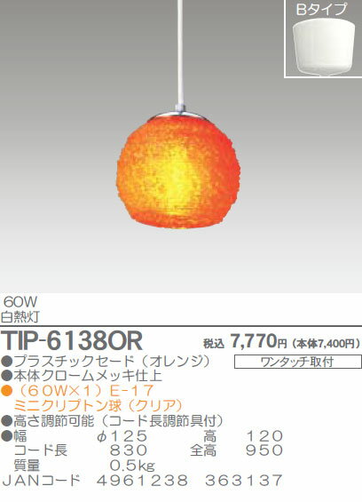 【送料無料】瀧住電機工業 ペンダント 60W 白熱灯 TIP-6138OR価格: 4,480円レビュー評価: 0.0 レビュー数:0 ●プラスチックセード(オレンジ) ●本体クロームメッキ仕上●(60W×1)E-17 ミニクリプトン球(クリア) ●高さ調節可能(コード長調節具付) ●幅φ125・高120・コード長830・全高950・質量0.5kg ●JANコード 4961238363137●ワンタッチ取付♪照明器具の取付方法はこちら※商品によってはハンドメイドの為、寸法・色味及び模様が多少異なる場合があります。※在庫状況により、製品によっては納期がかかる場合があります。詳しい納期はお問い合わせください。※電球形蛍光ランプを使用した器具は、調光器とは併用できません。※安全の為、写真通りの取付方向以外のご使用はお避け下さい。TA |