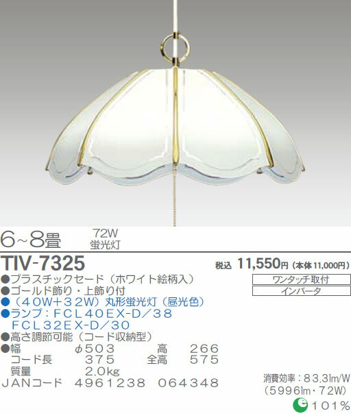 【送料無料】瀧住電機工業 ペンダント 6?8畳 72W 蛍光灯 TIV-7325価格: 6,980円レビュー評価: 0.0 レビュー数:0 ●プラスチックセード(ホワイト絵柄入) ●ゴールド飾り・上飾り付 ●(40W+32W)丸形蛍光灯(昼光色) ●ランプ:FCL40EX-D/38・FCL32EX-D/30 ●高さ調節可能(コード収納型) ●幅φ503・高266・コード長375・全高575・質量2.0kg ●JANコード 4961238064348 ●インバータ●ワンタッチ取付♪照明器具の取付方法はこちら※商品によってはハンドメイドの為、寸法・色味及び模様が多少異なる場合があります。※在庫状況により、製品によっては納期がかかる場合があります。詳しい納期はお問い合わせください。※電球形蛍光ランプを使用した器具は、調光器とは併用できま |